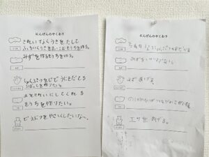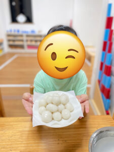2-3歳児クラスのお仕事です。絞る、注ぐ、つまむなど日常生活に必要な動きを練習しています。