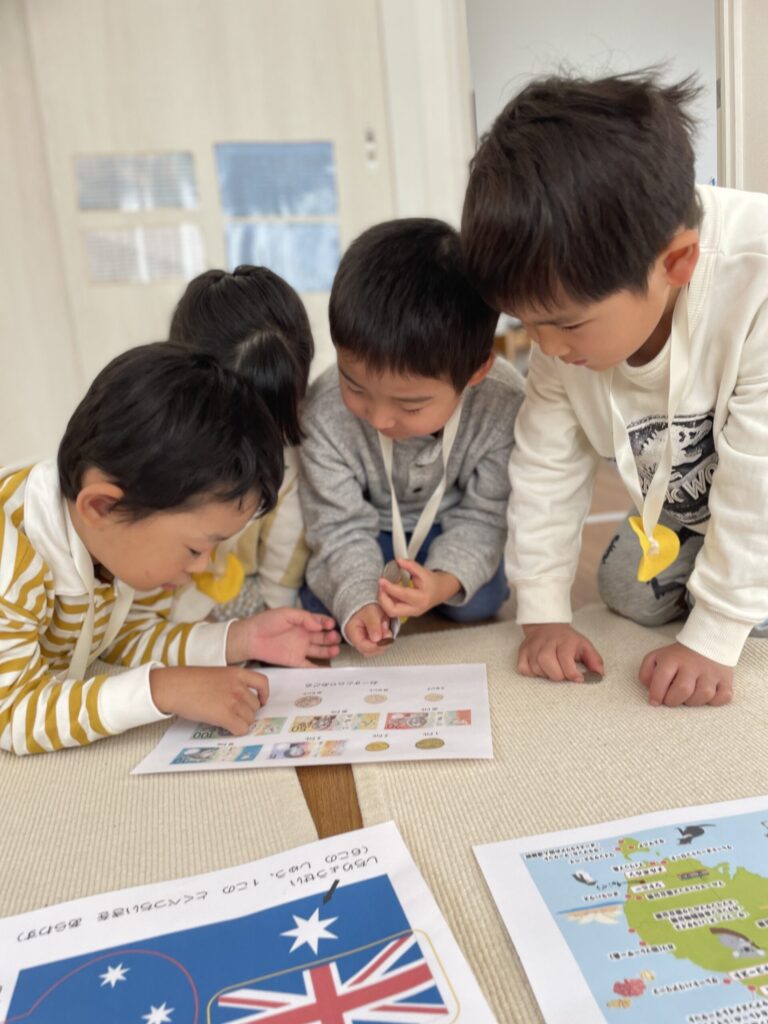 オーストラリアの紹介もしました。オーストラリアのお金に触ってみたり、有名なお菓子を食べてみたり。五感で感じたことはよく覚えているものです。「今度はフランスのこと教えて」というリクエストも。世界に興味津々の子ども達です。