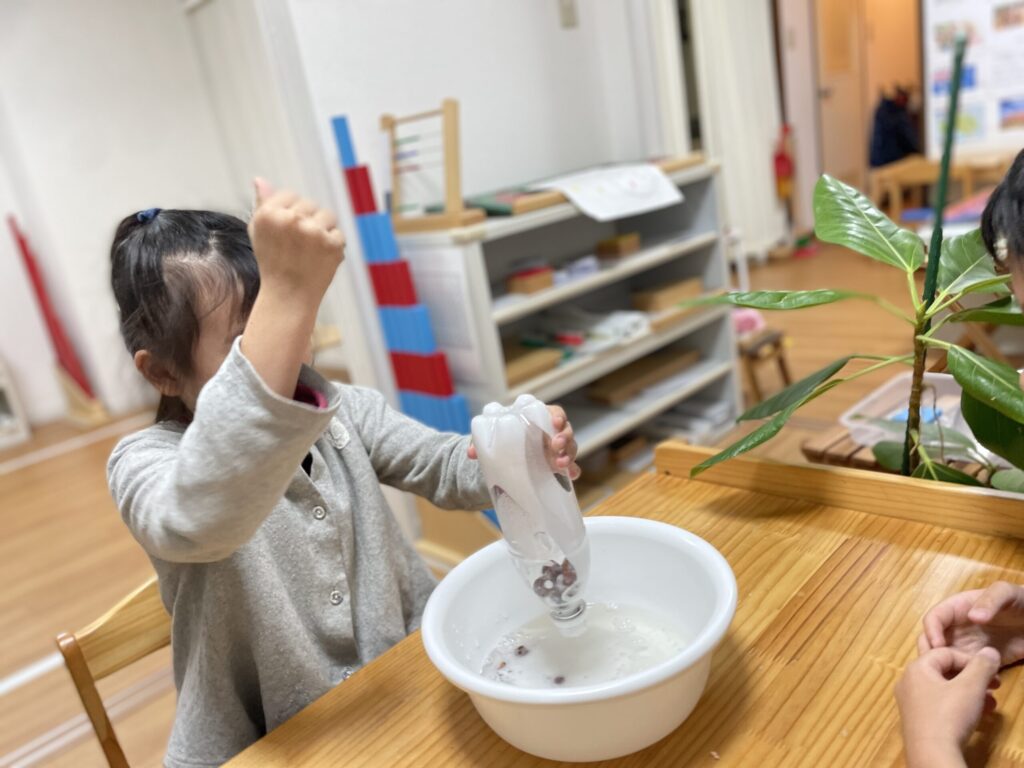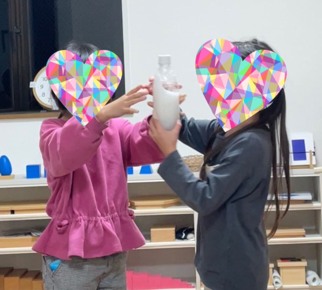 まずペットボトルにお湯を注ぎ、木の実の皮を5~6個入れます。振ると一気に泡立ち、ペットボトルが真っ白に!まさか木の実から泡が出て来ると思わず、子ども達もびっくり
