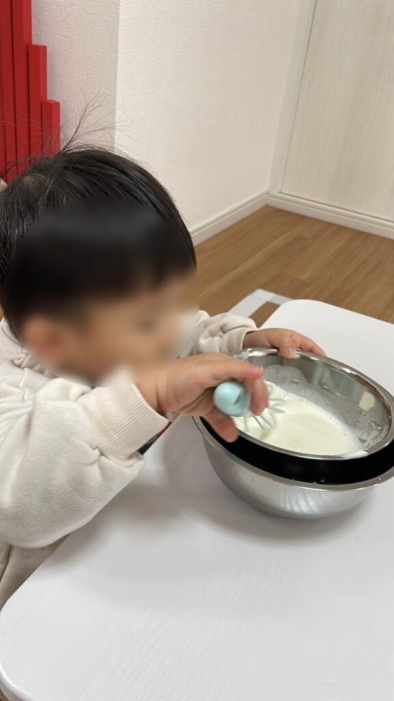 生クリームが液体だと初めて知った子がほとんど。みんなで力を合わせて混ぜ続けます。レモン汁を入れて混ぜると一気にクリーム状に!「このまま食べたい」と気持ちが逸る子も。