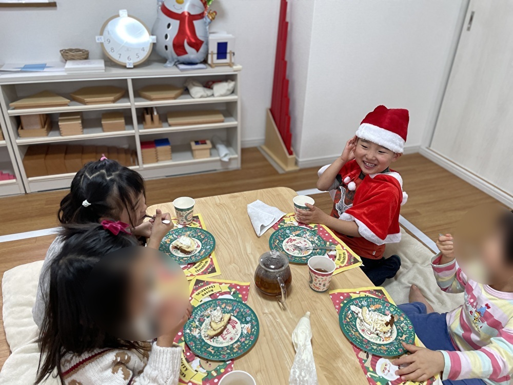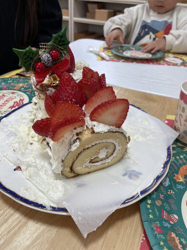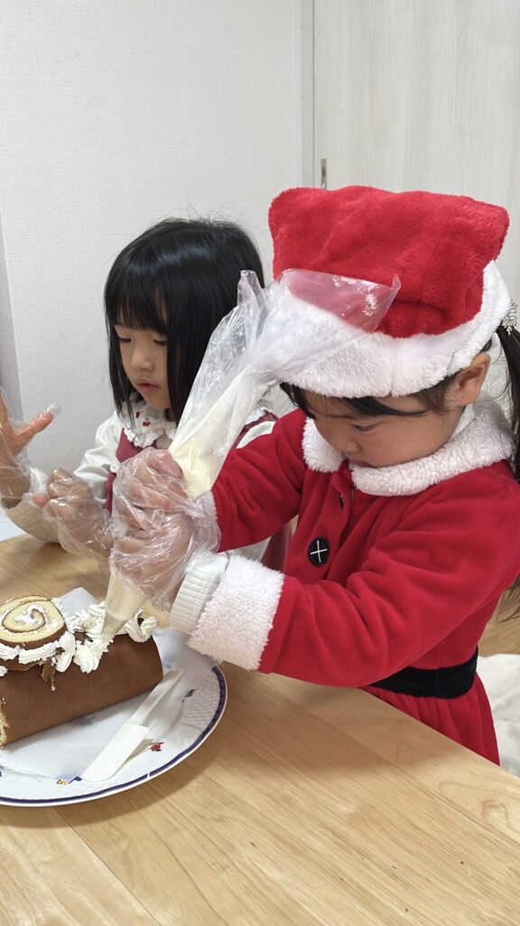 今年はブッシュドノエル作り★液状の生クリームを泡立て、スイスロールに盛り付けました。