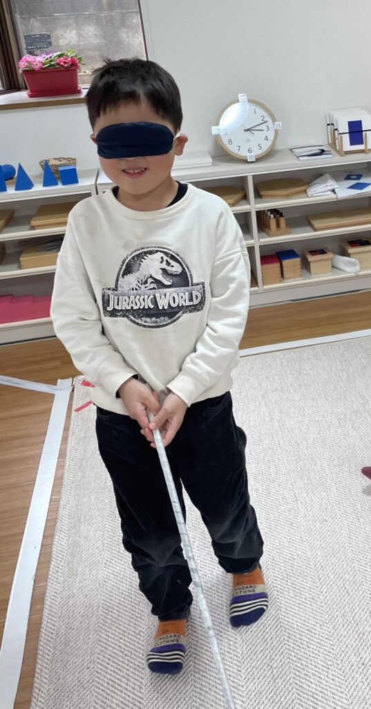 アイマスクをして歩いてみたり、お友だちに手を引いてもらったりしながら、「見えないってどんな感じ?」を体験しました。