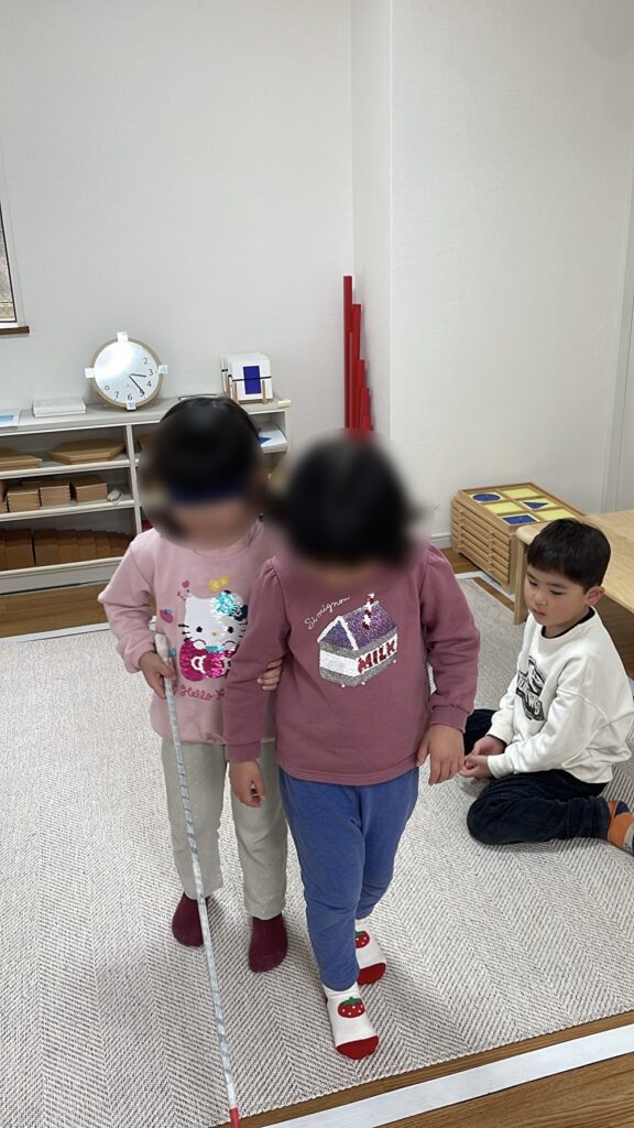 「歩くだけでも大変だね」と、普段とは違う感覚に気付いたり、「次は左に曲がるよ」と声で伝えることの大切さを感じたりする姿が見られました。